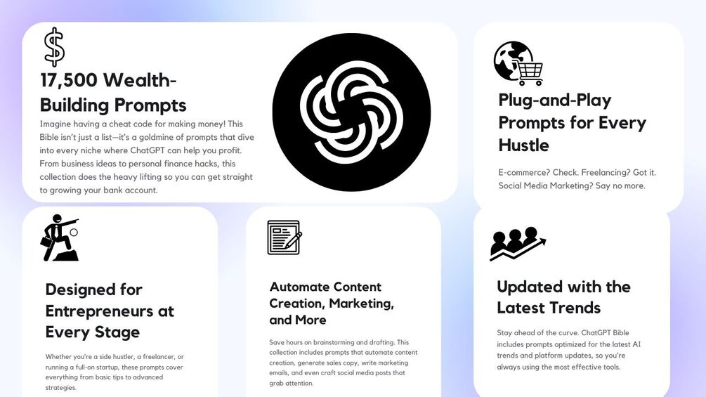- Monetization Blueprint: A complete guide on transforming ChatGPT into a profitable side hustle or business.